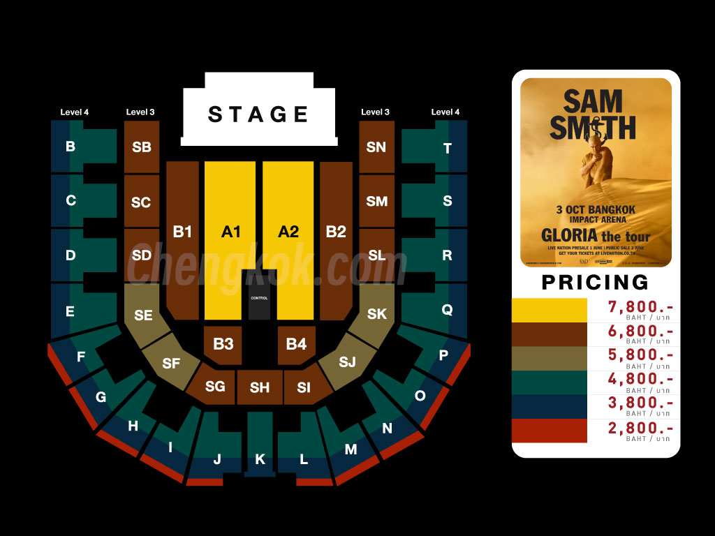 门票价格(THB):7,800 / 6,800 / 5,800 / 4,800 / 3,800 / 2,800 (泰国货币)