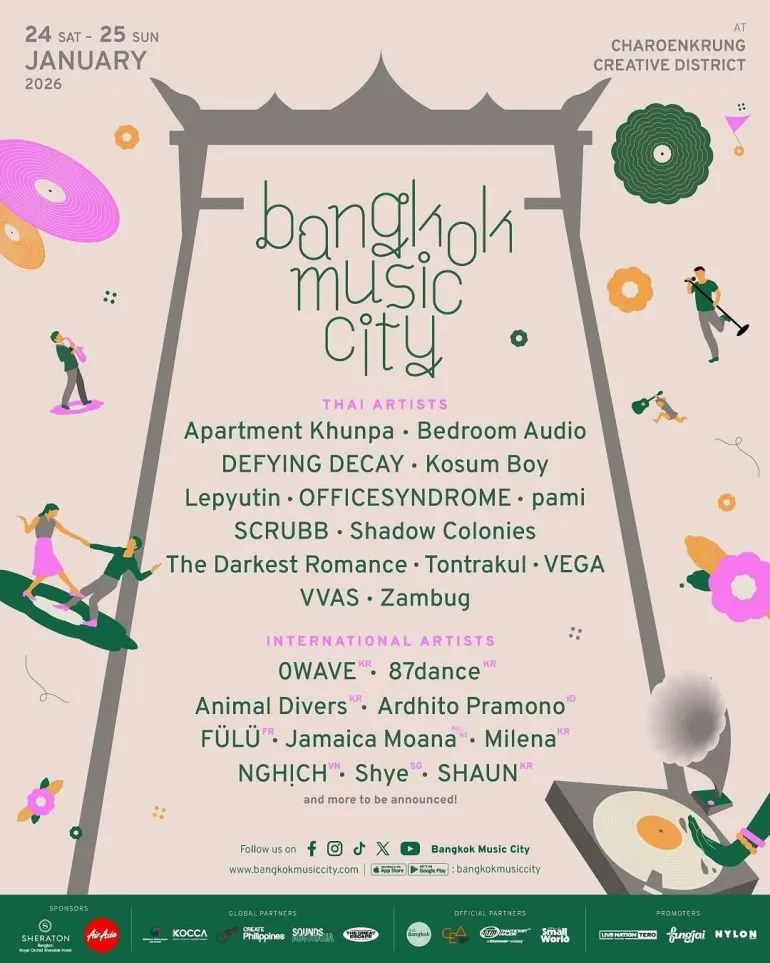 2026年1月24日(周六)至25日(周日),“曼谷音乐城 2026”音乐节将在曼谷Charoenkrung创意园区火热上演!活动下午3点开始入场,演出下午4点准时开唱。这场为期两天的音乐盛宴汇聚了本地、地区及国际上的多元音乐人,带来现场音乐会、音乐展示及行业交流等丰富内容。