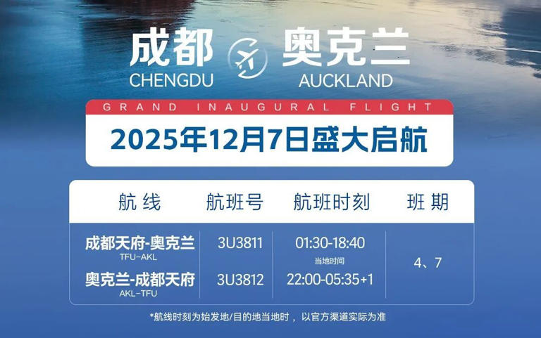 此外,川航还计划于12月7日复航成都天府直飞新西兰奥克兰航线,每周四、周日由A350机型执飞。该航线的恢复,将进一步强化成都与南太平洋地区的航空连接,为商务及旅游旅客提供更多选择。